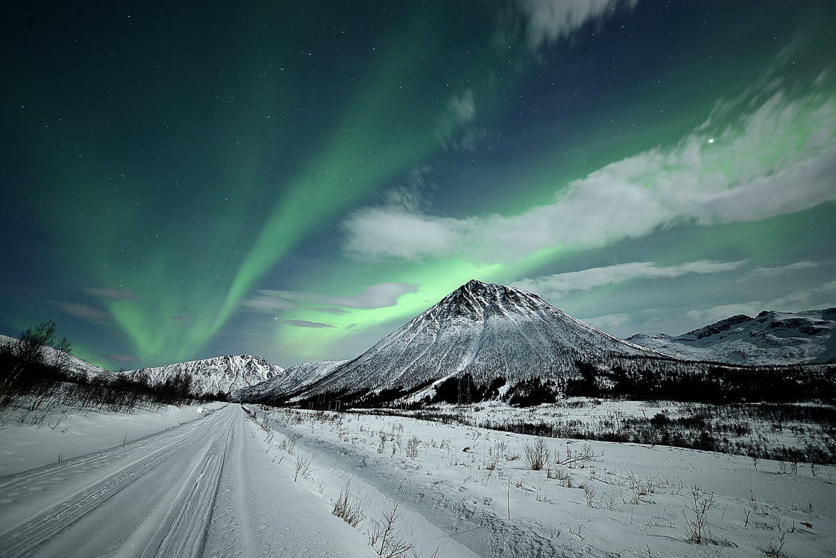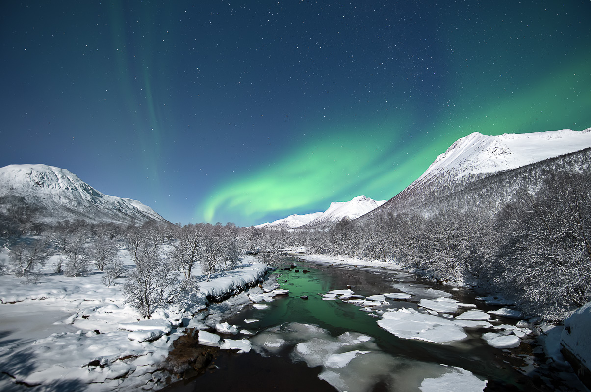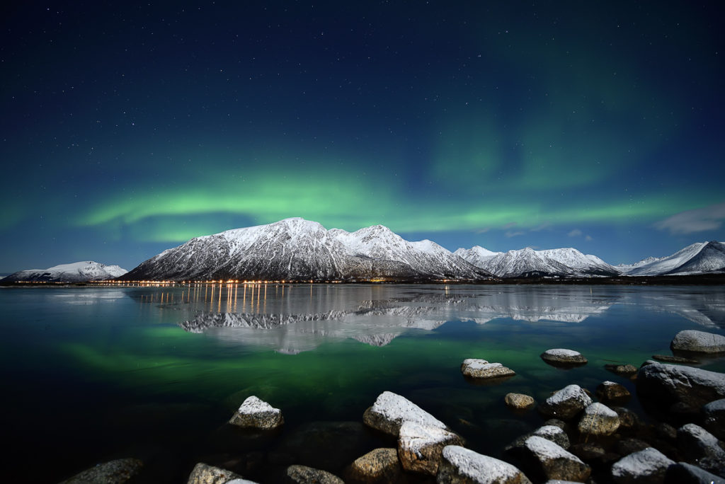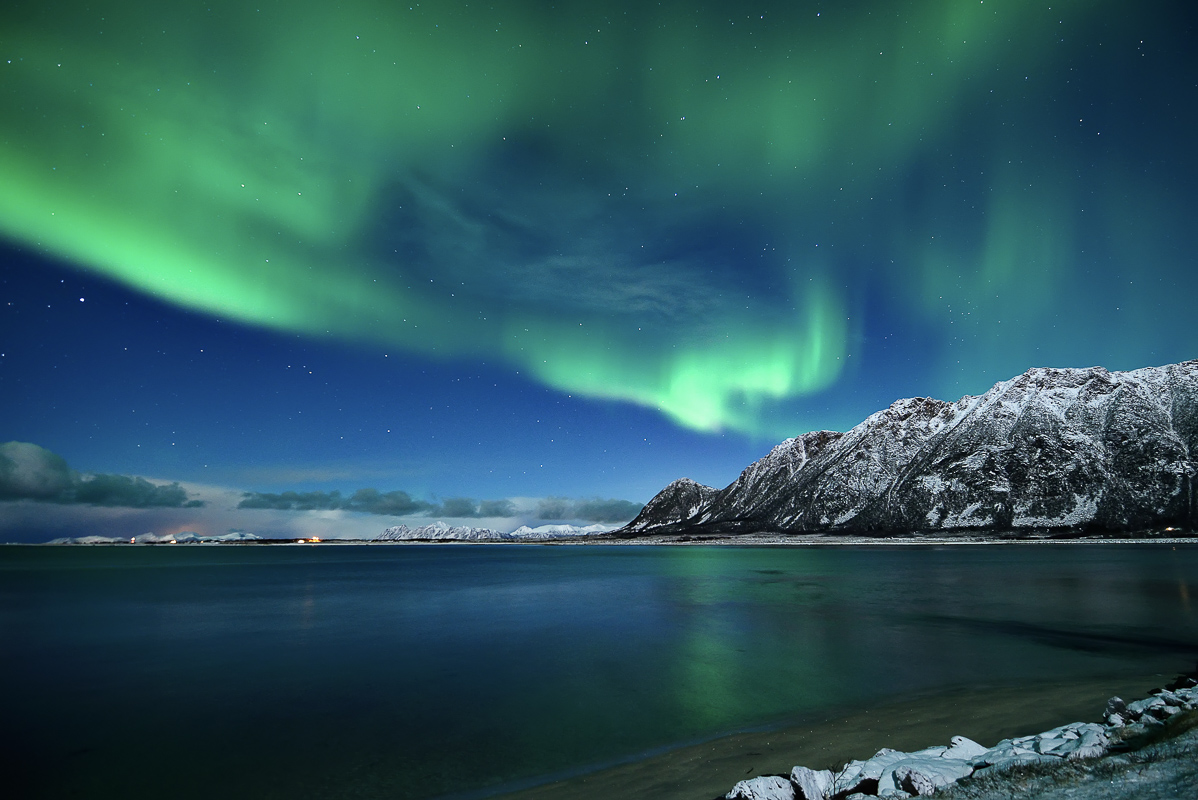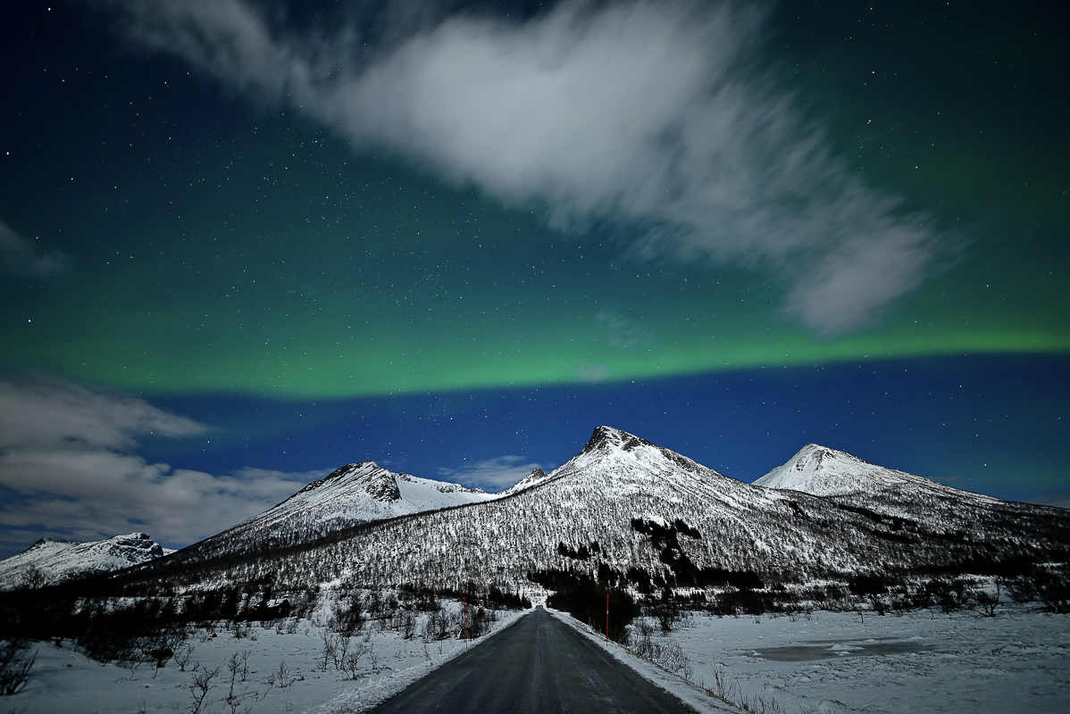Sometimes you imagine how a photo can look really good if the conditions are right. And you plan it in your head over several years. This photo from Forfjord is a good example. Here I envisioned it in absolute calm after a snow fall, and Northern Lights erupting with the tide coming in. It would then be possible to get a photo with snowclad rocks in the foreground matching the mountain in the back. In addition, I imagined the full moon from behind to lit up the landscape, and the Northern Lights to mirror in the sea. One evening I was lucky to capture it all on my memory card. The weak Northern Lights allowed me a longer shutter speed without burning out the Northern Lights as well.