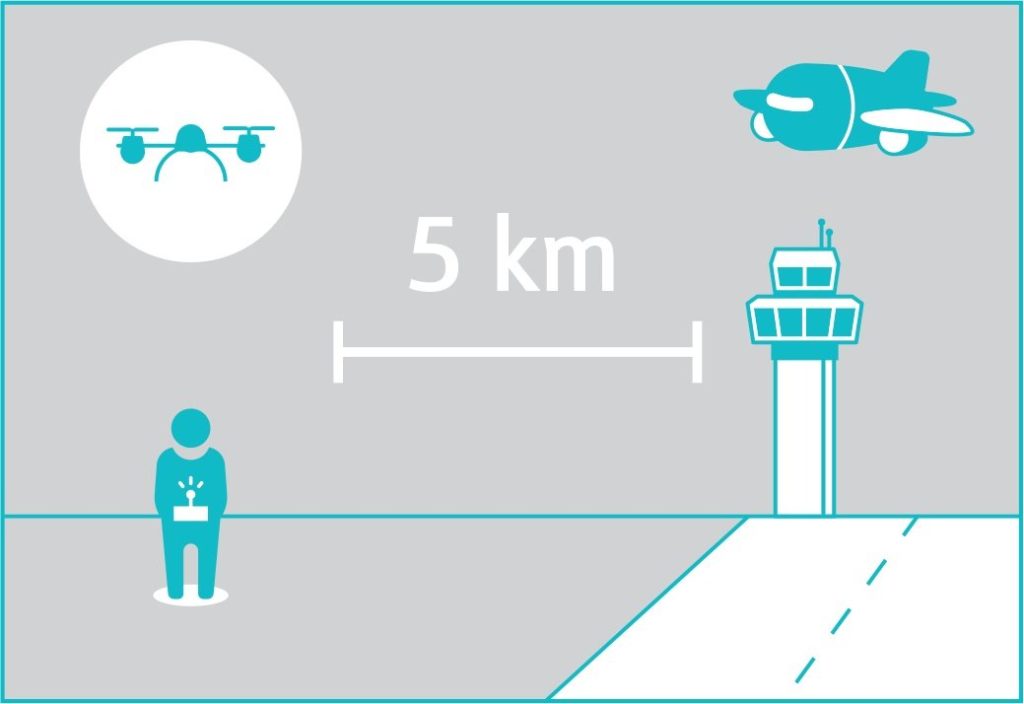 - Do not fly within a 5km radius of any airport unless otherwise agreed with authorities.