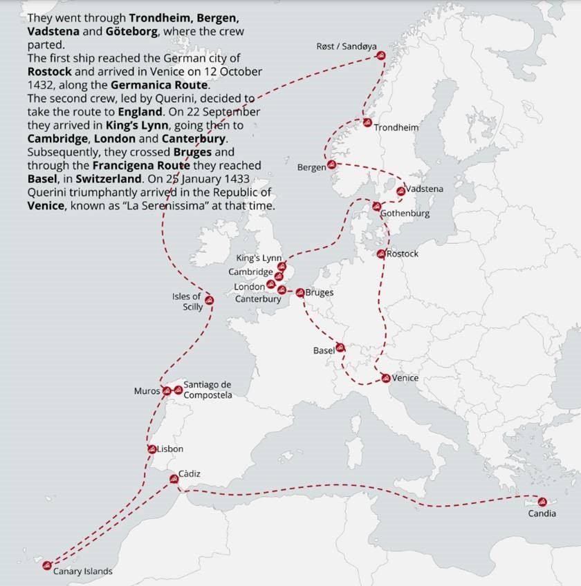 Pietro Querini, a Venetian patrician and merchant, left the moorings of Candia on 25 April 1431, with his Cocca “Querina” and 68 men on board, a cargo of 800 barrels of Malvasia and other valuable merchandise, with the goal of reaching Flanders. However, after a fortunate and dramatic shipwreck, Querini and his crew set off on what would be an impressive voyage which would lead them to the Lofoten Archipelago, well beyond the Arctic Circle.