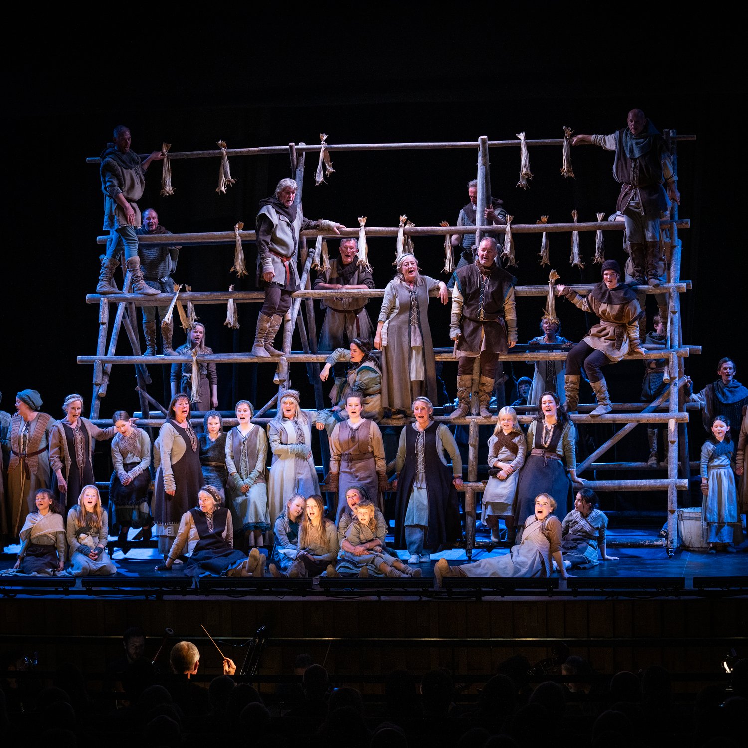 The music is composed by Henning Sommerro and the libretto is written by Ragnar Olsen. The music moves between classical opera, Gregorian chant, Norwegian folk music and contemporary music. In the performance, the audience will experience singing in several languages: