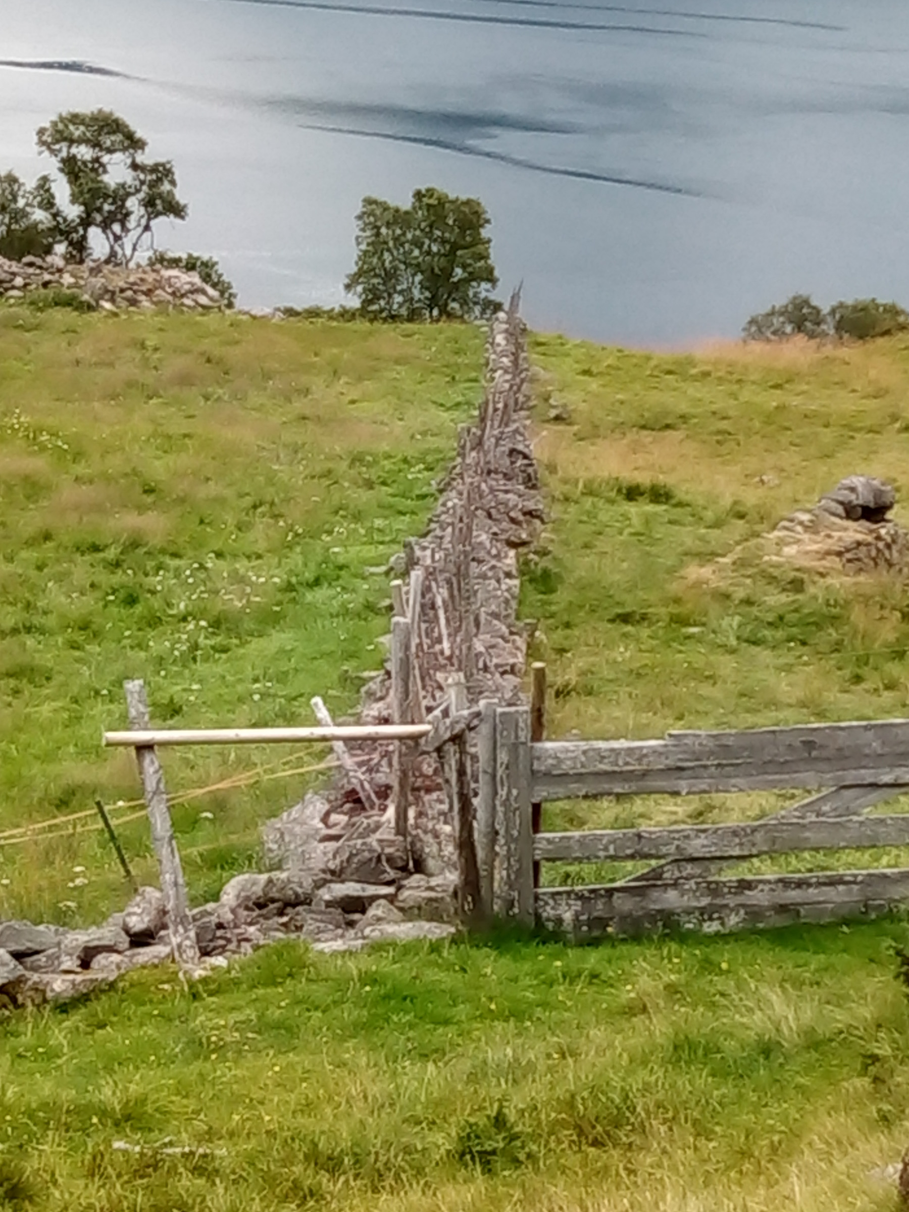 The walk is not a difficult one. We followed a succession of fences made of stone or wire mesh. The occasional wooden gate provides access to the tended fields below, but they are closed. There are also stiles, and at one location, we saw an old hay mower. A sturdy sheep pen, a picnic bench, and even a wooden lavvu shelter—this is not untouched nature but part of everyday life in the area. We walked on planks across bogs and stepped from one stone to another across streams. Nothing felt strenuous or difficult, though. We also had company; sheep watched us from beneath the trees, where they had sought refuge from the rain.