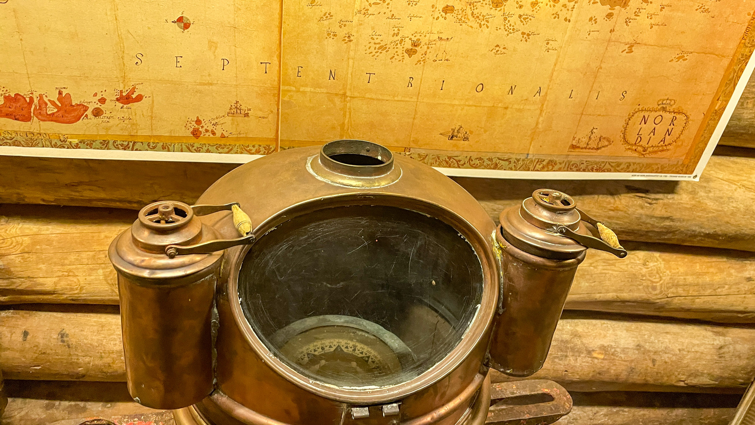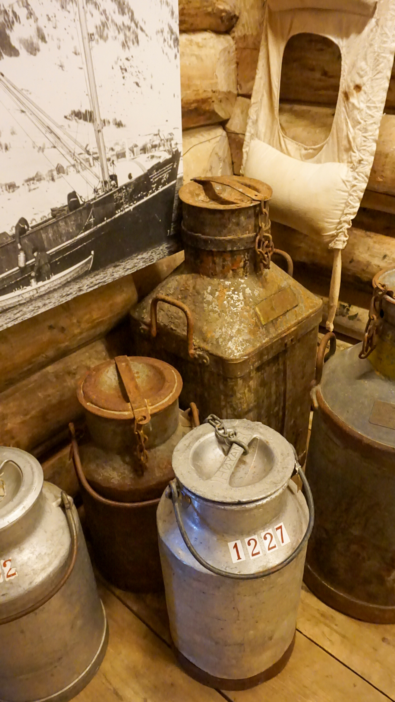 From the shop, I entered the spacious storage, where stockfish once would be stacked in high piles, awaiting transport on a jekt to Bergen. The smell of fish long gone; this is where you find exhibits about local themes. The texts are short and to-the-point. They are accompanied by old photos and lots of historical treasures, from a milk separator to old maps and Russian bark imported to isolate turf roofs. And much more.
