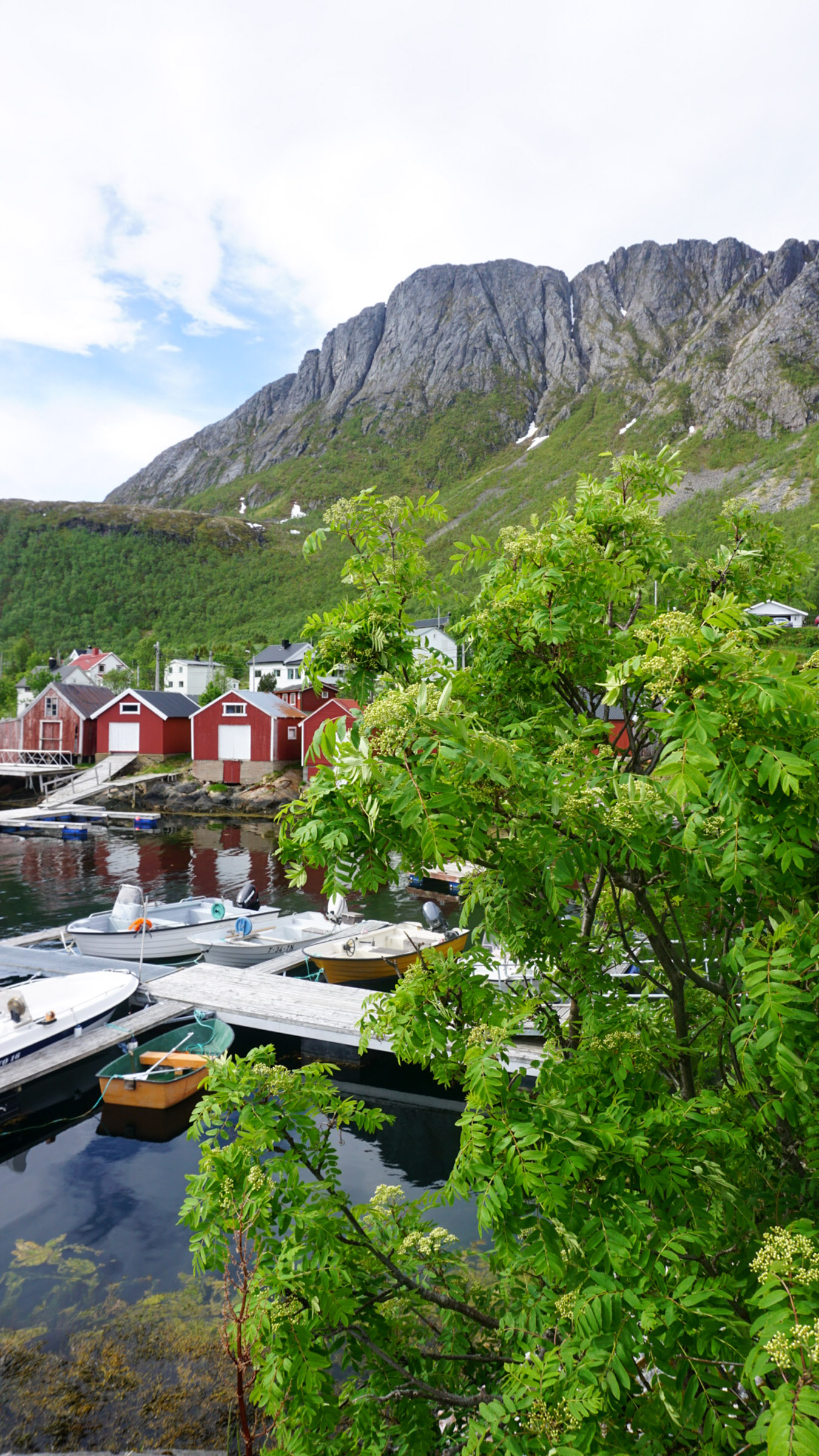 On the way to Skrolsvik, the detour to Rødsand is delightful. A low pass between fjords takes you along the Olaheimvatnet lake with its little islands and cluster of farms to a small fishing village. Here the red boat houses around the port form a backdrop for views to the steep, monumental Lomstinden across the fjord. A few kilometres that sum up Senja.