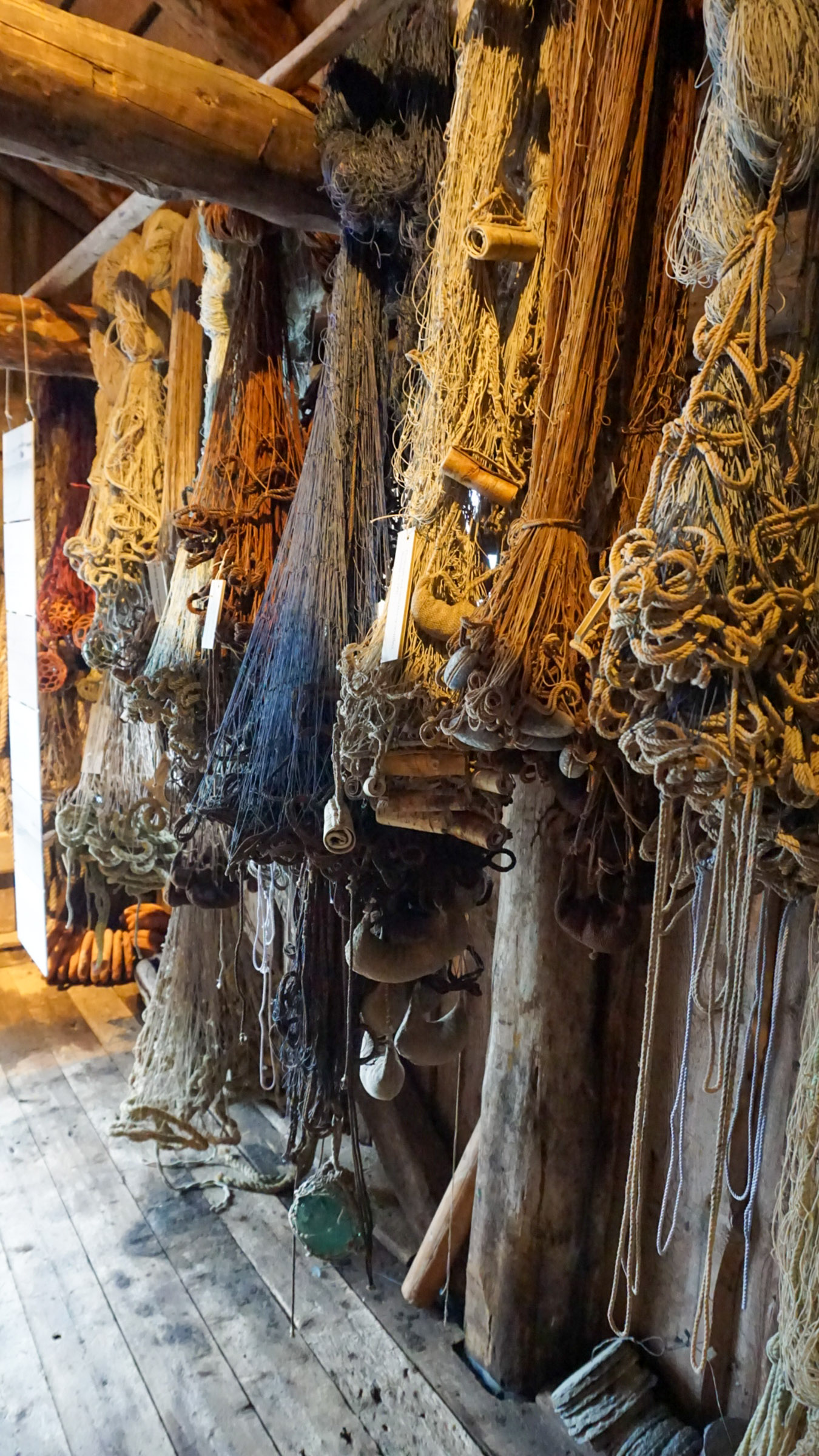 From the shop, I entered the spacious storage, where stockfish once would be stacked in high piles, awaiting transport on a jekt to Bergen. The smell of fish long gone; this is where you find exhibits about local themes. The texts are short and to-the-point. They are accompanied by old photos and lots of historical treasures, from a milk separator to old maps and Russian bark imported to isolate turf roofs. And much more.